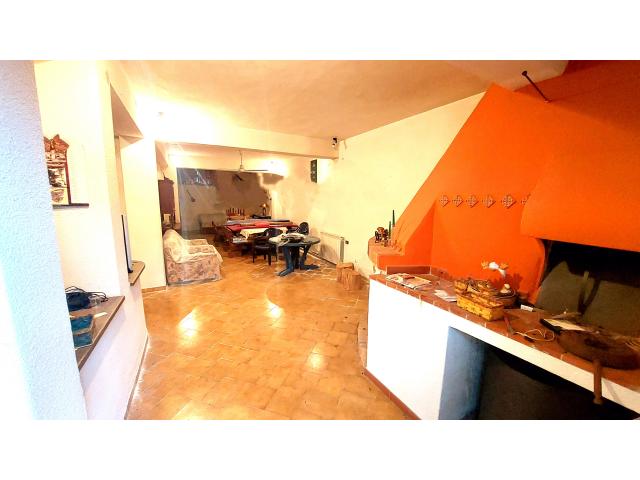 Taverna a piano semicantinato con camino, angolo cottura e servizio igienico.